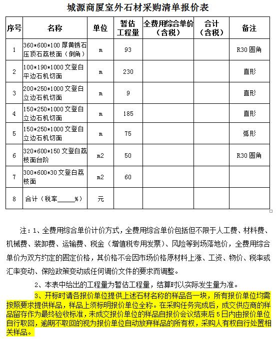 (5)采購范圍:城源商廈室外石材的采購、運輸、裝卸等相關工作,具體內容詳見采購文件。